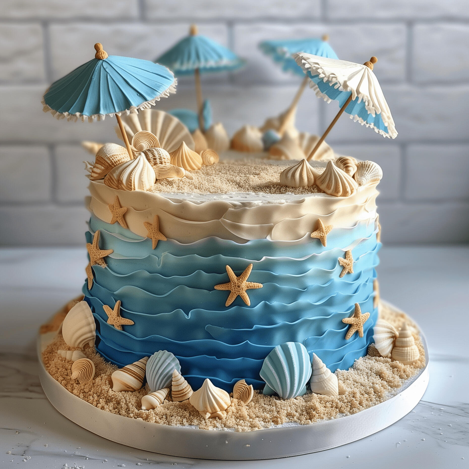 Transport your celebration to a warm sunny paradise with a beach-themed cake, decorated with seashells, palm trees, and sandy shores.