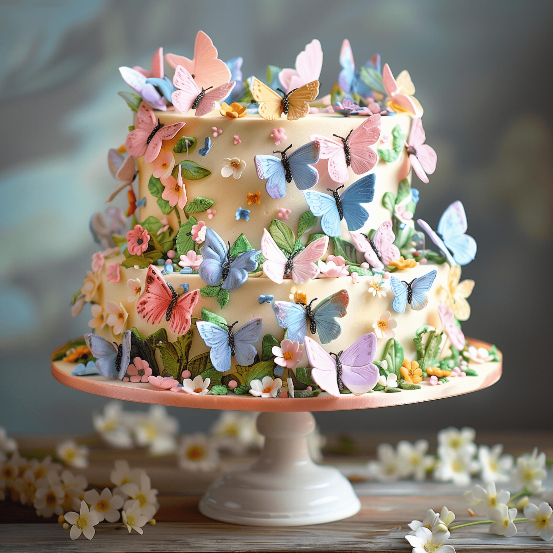 A butterfly-themed cake adorned with vibrant butterflies and delicate flowers, perfect for nature enthusiasts and garden lovers.
