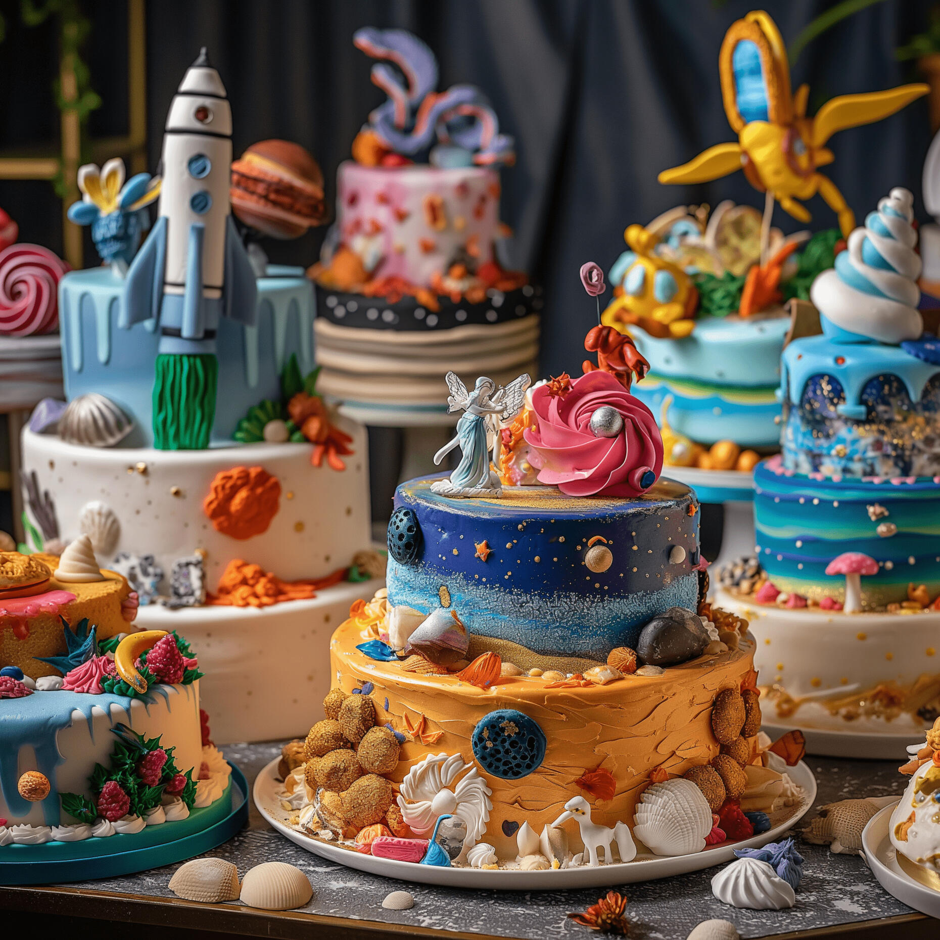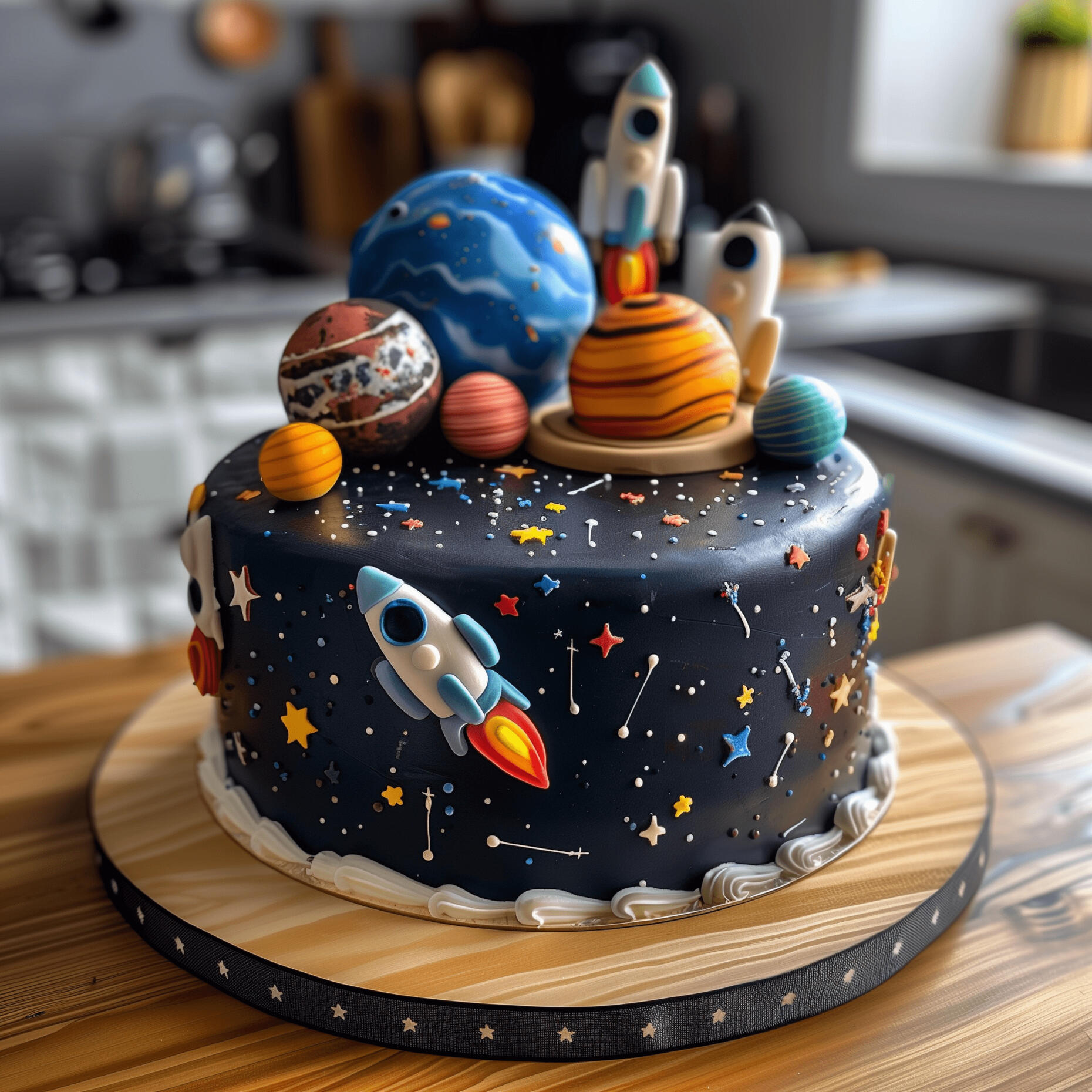 A space-themed cake for your young explorer who loves the wonders of the universe, complete with planets, rockets, and tiny astronauts.