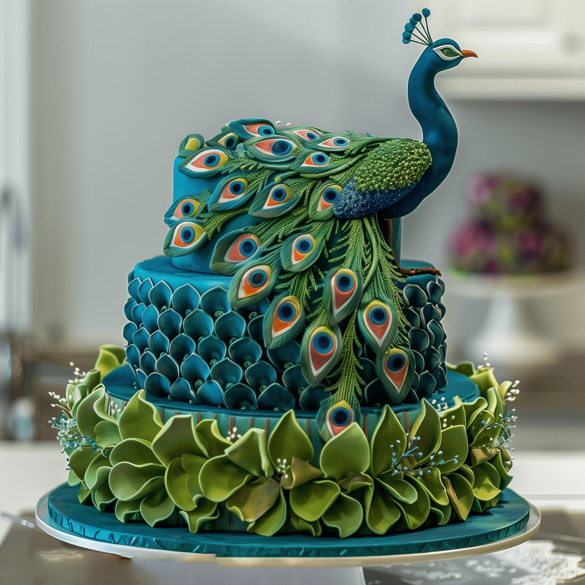 Add elegance to any event with a peacock-themed cake, featuring vibrant peacock feathers and intricate, colorful designs.